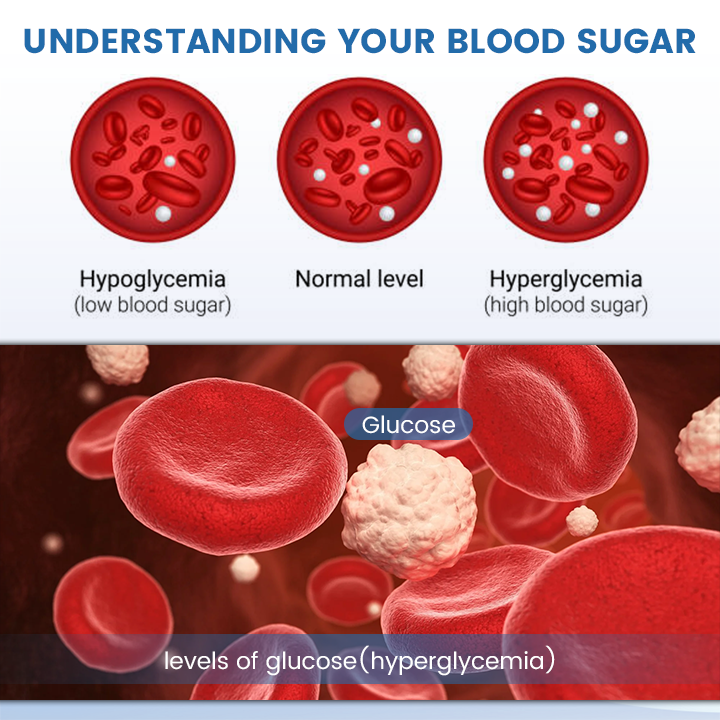 Blood sugar, or blood glucose, is the amount of glucose (sugar) in your bloodstream, which comes from the food you eat. It's a vital energy source for your body's cells, and foods high in carbs and starches can cause blood sugar levels to rise as they break down into simpler sugars.