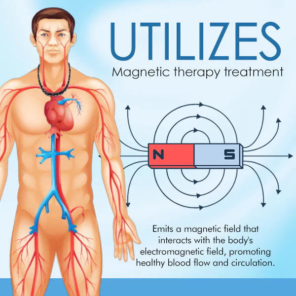 CardioCare™ Hematite Therapy Necklace is a therapeutic accessory that works by utilizing a combination of magnetic therapy, far-infrared therapy, & negative ions. When worn close to the skin, the necklace emits a magnetic field that interacts with the body's electromagnetic field, promoting healthy blood flow and circulation.